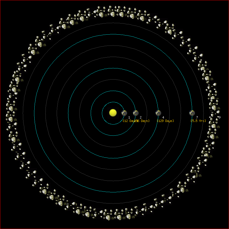 | Distance: | 0 AU | 0.05 AU | 0.32 AU | 0.62 AU | 0.92 AU | 1.52 AU | 2.72 AU | 2.85 AU | 5.12 AU | 9.92 AU | 19.52 AU | 38.72 AU |